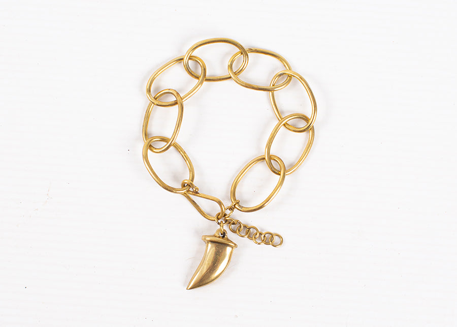 This chunky bracelet is made from brass. It is finished off with a clasp to adjust for size, and is finished off with a horn charm. Elegant and timeless.
