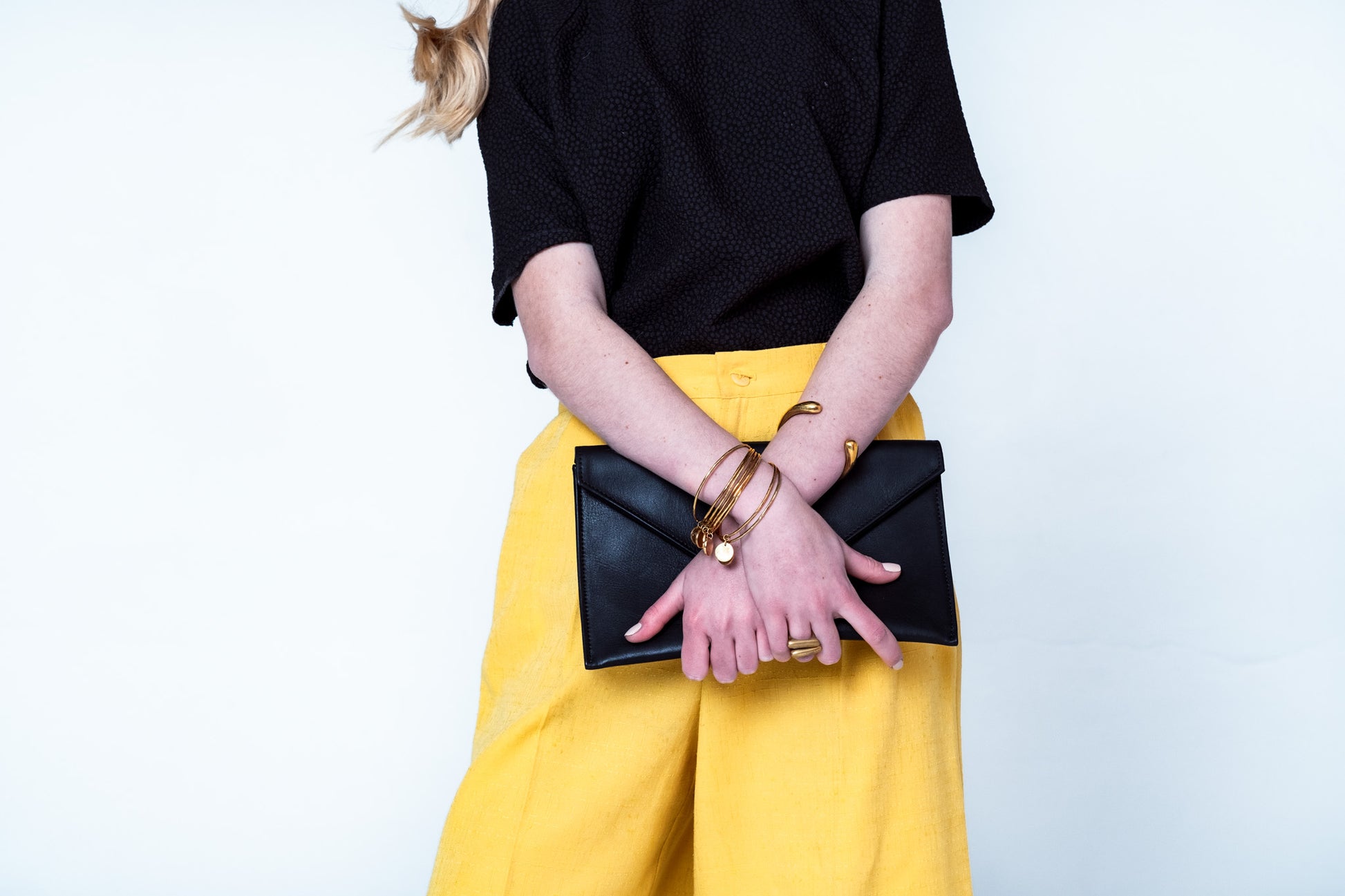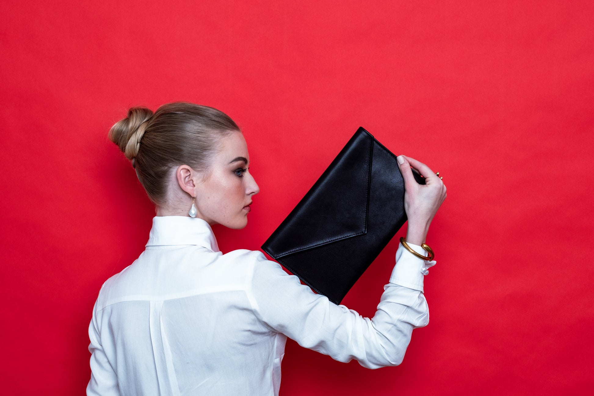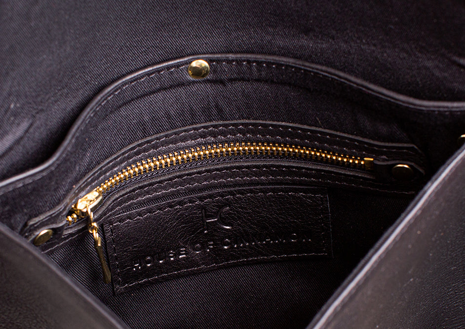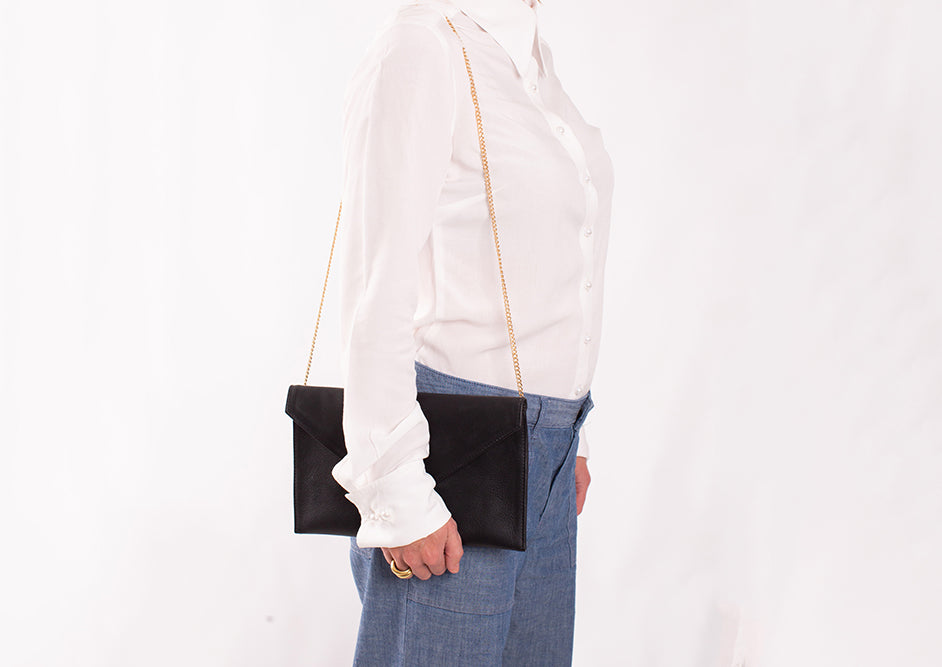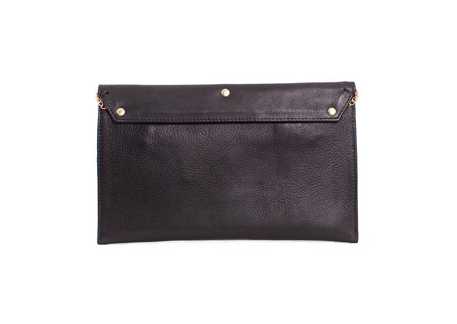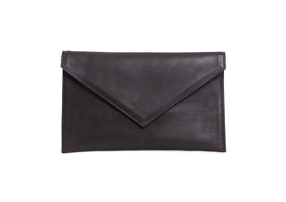 This classic 'envelope' clutch is crafted from black leather. This clutch has a separate inside compartment and a magnetic catch. This clutch is big enough for your phone, your cardholder and a lipstick.