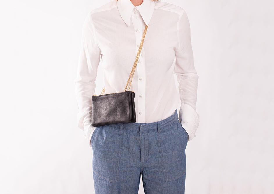 A perfectly sized clutch bag. Carry it in hand or over the shoulder. Handcrafted in limited numbers using a black nappa leather. This clutch has two separate compartments that each have their own zip and is finished off with a delicate chain. This clutch has just enough space for your cardholder, lipstick and phone.