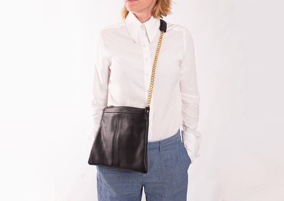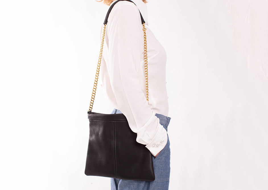 The Jodine Shoulder bag is crafted from supple black nappa leather and has a slim, non-bulky silhouette. The gold chain strap can be worn over your shoulder or worn cross body. This bag has a separate inside compartment and is finished off with a beautiful chain with some leather detail over the shoulder.