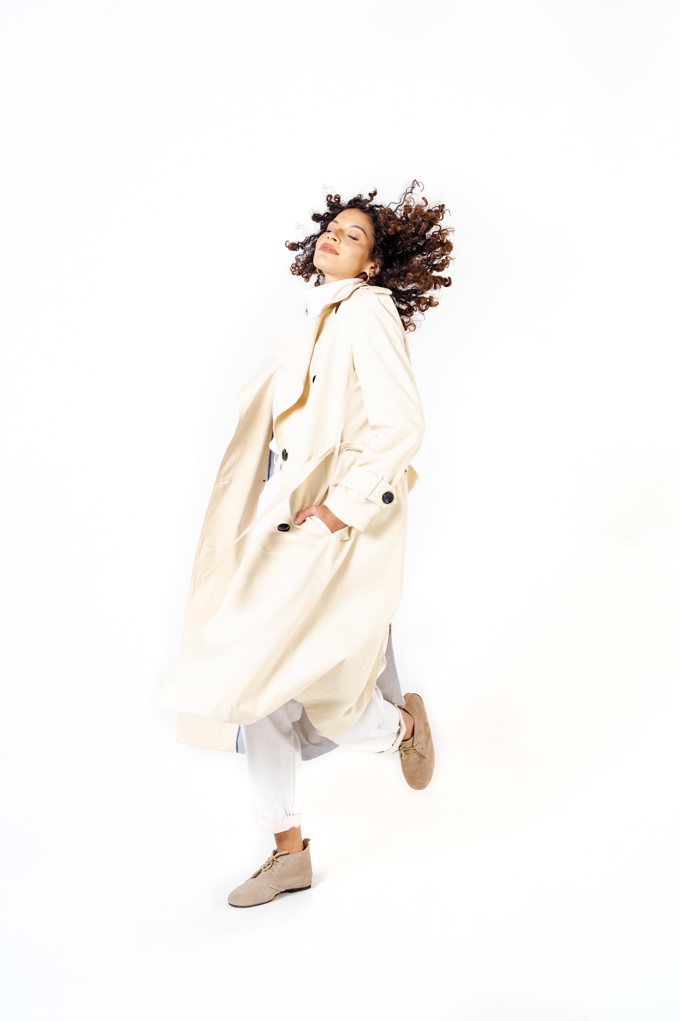 The Stella trench is the perfect length and the perfect colour. Handcrafted using gabardine fabric and lined with a blue and white striped lining this trench is timeless and can be worn with anything from a pair of jeans to a fitted pair of trousers.
